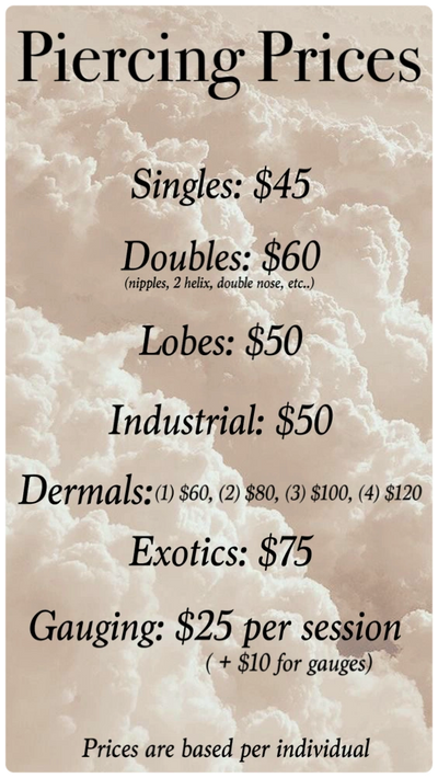Everything that is used for all piercings is sterilized with a hospital-grade Autoclave. Everything utilized in the piercing procedure is sterilized, including: jewelry, needles, tools, paper towels, and cotton swabs. Single use needles are disposed of in a sharps safety after each use. Each client has a brand new set up with all sterile equiptment, and surfaces are wiped down with disinfectants between each client.